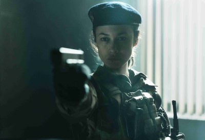 I SENTINELLE är Olga Kurylenko allt annat än en glamorös actionhjältinna. Hennes rollfigur Klara är sliten, härjad, och lider av posttraumatisk stress. Hon tillhör ett franskt militärförband, och har precis återvänt till Nice från Syrien. Filmen inleds i Syrien, där Klara upplever några chockerande händelser.