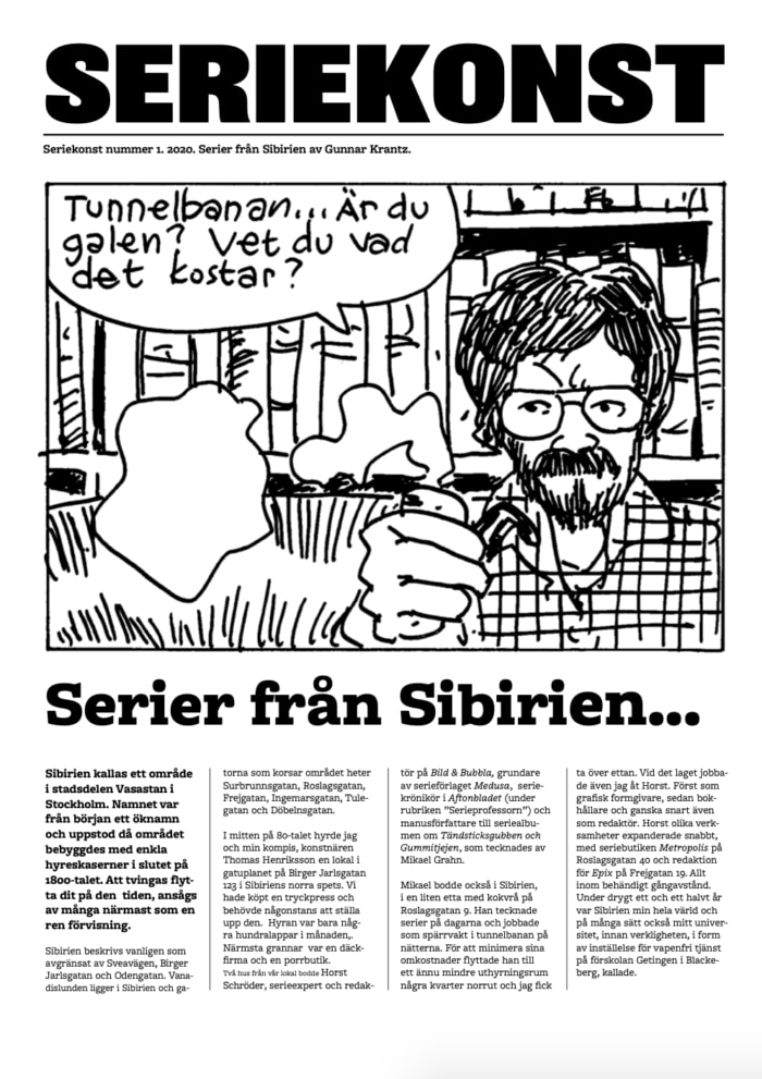 Gunnar Krantz gör fortfarande serier. Numera publicerar han sig oftast på nätet, hans serier finns att ladda ner som pdf-filmer på Seriekonst.se. Men – häromåret köpte Gunnars universitet in en risograf, ett slags tryckpress. 2019 gav Gunnar ut det trevliga fanzinet Malmö Rock City, och alldeles nyligen lät han trycka upp Seriekonst nr 1/2020, ”Serier från Sibirien”. Jag hade redan läst denna serienovell som pdf (du kan ladda ner den HÄR), men det var onekligen något visst med att få den tryckt på papper. Inte bara det, den tolvsidiga tidningen är i stort, fint kvällstidningsformat.