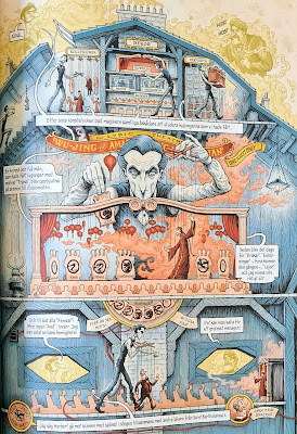 När jag öppnade boken höll jag på att trilla baklänges. Jösses! Det här ser ju fullkomligt … fantastiskt ut! Här finns så mycket att titta på att man kan dröja kvar vid varje sida i princip hur länge som helst. Otroligt mycket detaljer, tecknat i en egen, lite kopparsnittsliknande stil. Och det är tjusigt.