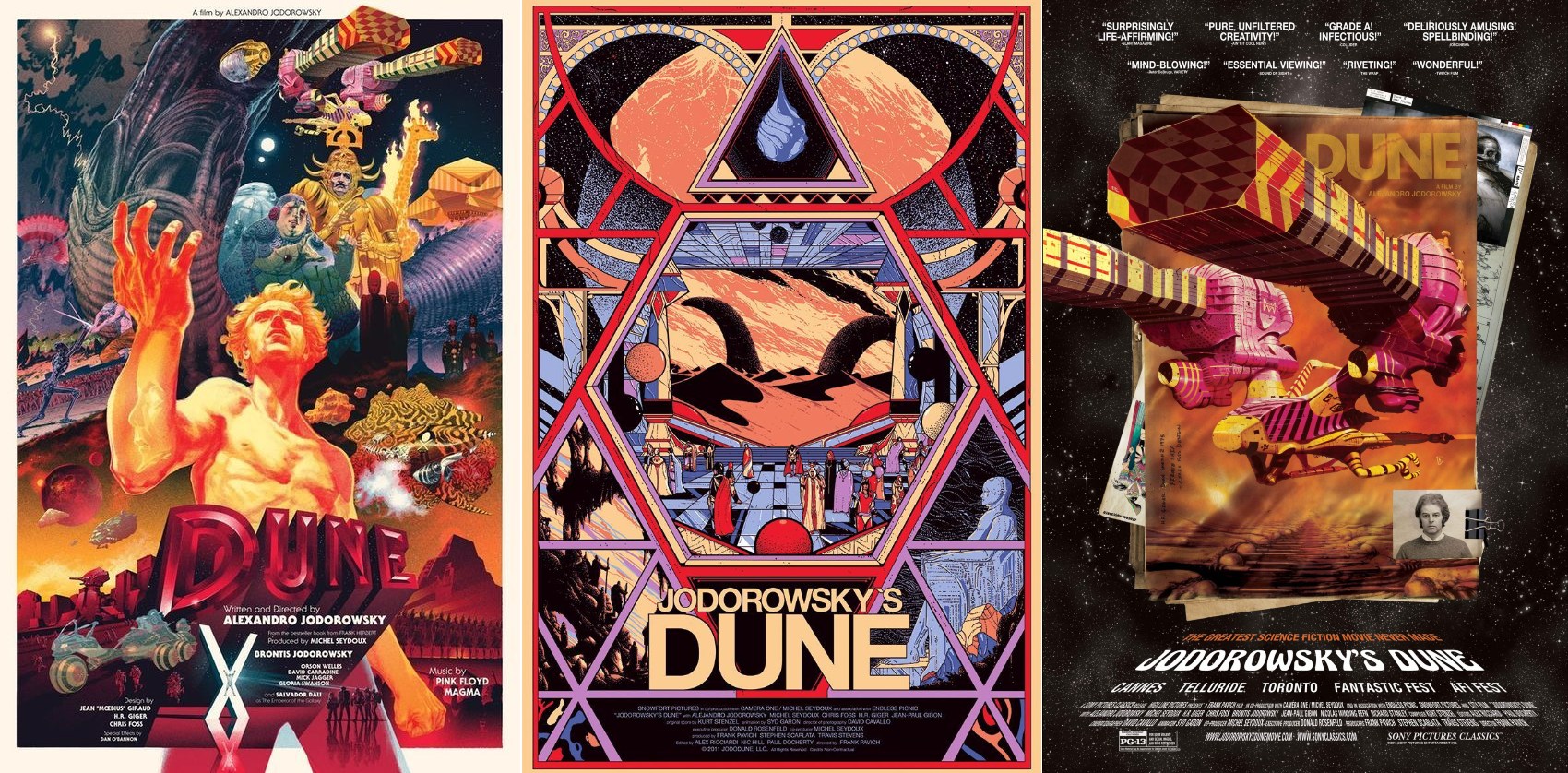 Redan i mitten av 1970-talet skulle romanen filmatiseras. Då var det den härlige vildhjärnan Alejandro Jodorowsky som höll i spakarna. Jodorowsky anlitade HR Giger, Chris Foss och Jean ”Moebius” Giraud för att designa kulisser och gestalter, Dan O’Bannon skulle stå för specialeffekterna, Pink Floyd skulle komponera musiken, och till rollerna anlitades folk som Salvador Dalí, Orson Welles, Mick Jagger och Udo Kier. Tyvärr lyckades man aldrig skrapa ihop tillräckligt med pengar, budgeten växte konstant, och projektet lades ner. Det är ju synd – det här hade kunnat bli en lika fantastisk som vansinnig film. Den som vill veta mer om detta filmprojekt kan se dokumentärfilmen JODOROWSKY’S DUNE, som kom 2013.