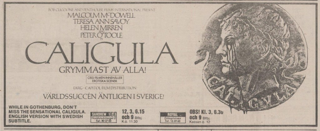 Den på sin tid så utskällda filmen CALIGULA (1979, svensk premiär 1981) tillhör mina favoritfilmer. Jag såg den inte på bio när den kom, jag var för ung, men jag har haft den på video, DVD och nu har jag den på Blu-ray. Ett tag hade jag en kraftigt kortad version jag spelade in från en betalkanal i början av 90-talet. Jag har även en roman som bygger på filmen.