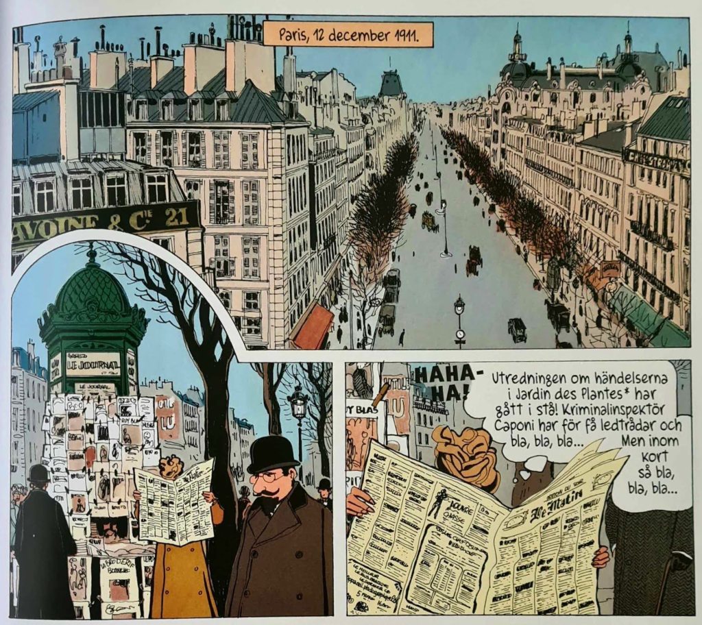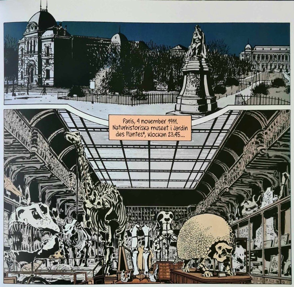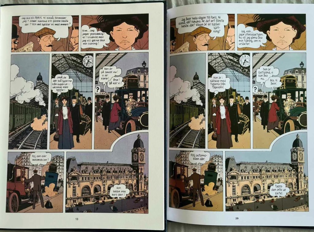 Som fallet är med många franskbelgiska serier, är Adèle en tidlös serie. När jag växte upp visste jag inte att de album med Tintin, Spirou och de andra var från 40-, 50- och 60-talen. Jag upplevde dem som nya. Det gick ofta att se på en amerikansk serie om den var gammal, de serierna hade ofta något träigt och mossigt över sig, men de franskbelgiska hade en elegans som gjorde att de kändes fräscha och moderna. Adèles äventyr skulle kunna vara tecknade idag. Samtidigt känns de rätt antika, vilket förstås är medvetet. De här två äventyren utspelar sig 1911 och 1912 – och det doftar verkligen 1910-tal om dem. Nu var jag förstås inte med på den tiden, men Tardis teckningar och Anne Delobels färgläggning skapar rätt stämningar. Det känns genuint, det är mörka och murriga nyanser, med mycket brunt och mossgrönt. Jag minns de återskapade hemmen från förra sekelskiftet som förr fanns på Landskrona Museum, de var mörka, murriga och luktade damm.