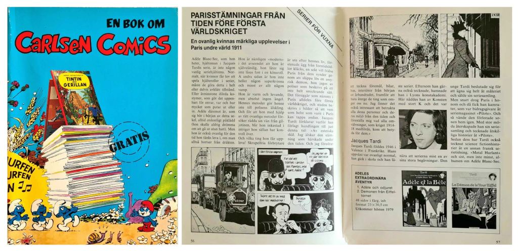 Tillbaka till 1979 och ”En bok om Carlsen Comics”. Jag läste kapitlen om ”Staden som inte fanns” av Pierre Christin och Enki Bilal, om Corto Maltese av Hugo Pratt, och om Adèle Blanc-Secs extraordinära äventyr av Jacques Tardi. Jag tittade på bilderna som illustrerade kapitlen. De såg inte alls ut som de serier jag dittills hade läst. Det vilade något mystiskt, spännande och lockande över dem. Beskrivningarna av serierna var lika mystiska, spännande och lockande.