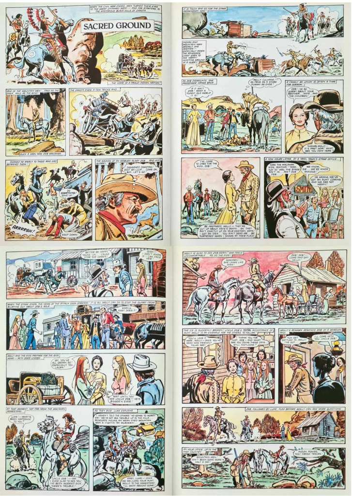 John M Burns ska visst också ha tecknat FAMILJEN MACAHAN åt tidningen Look-In 1978-1979. Jag plockade fram min Familjen Macahan-bok och tittade i den. De två serierna ser inte alls ut att vara tecknade av Burns. Men – efter ett tag hittade jag en signatur väl gömd i ett hörn: Edmond.