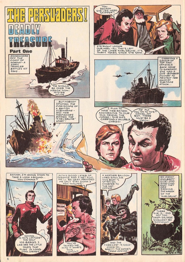Det fanns förstås betydligt fler serier byggda på TV-serier än de här i England. Första gången jag var i England, 1977, fascinerades jag av alla dessa brittiska serietidningar. Det vanligaste formatet var det större magasinsformatet, tidningarna kom varje vecka, de var rätt tunna och de trycktes på billigt papper. De hade grälla, skrikiga omslag och de bad om att bli köpta. Jag stod där storögt i kioskerna och tittade på omslagen. Det var mycket sport, krig och action, och det var mycket TV-serier, dessa fanns i magasin som Look-In och Countdown, den senare bytte efter ett tag namn till TV Action. Oj, MÅNBAS ALPHA! Och DR. WHO, som jag inte visste vad det var, men det såg ju fräckt ut. THE AVENGERS. APORNAS PLANET och grejor. Utbudet var spektakulärt och när mina föräldrar slutligen köpte en serietidning till mig, valde de … Kalle Anka.
