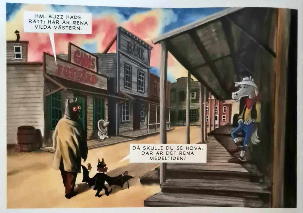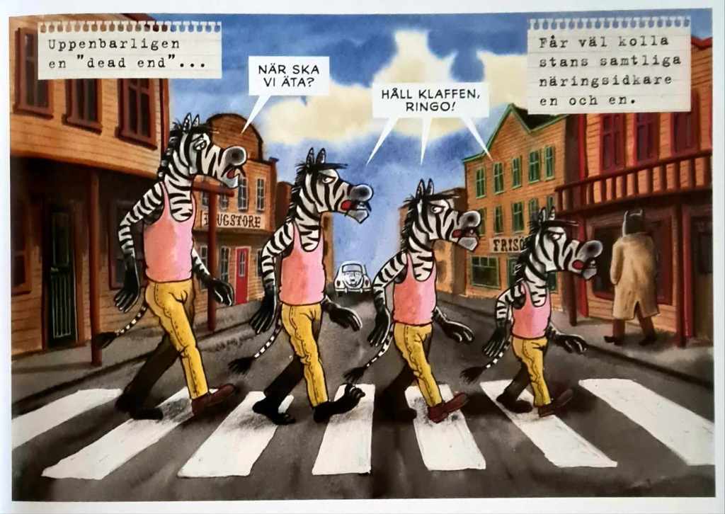 Lindengren verkar mest inspirerad av HARMONICA – EN HÄMNARE och i en ruta figurerar en motsvarighet till Charles Bronson som hastigast. En hund – som kanske inte är en hund? – är modellerad efter Clint Eastwood. Begravningsbyrån Gustavssons Döds säljer likkistor anpassade efter olika djur. På pizzerian Pizza Tokyo äter man pizza med ätpinnar och det dyker upp ett vitsande lamadjur från Dalarna. Återigen finns här referenser till kända konstverk, målare och tecknare.