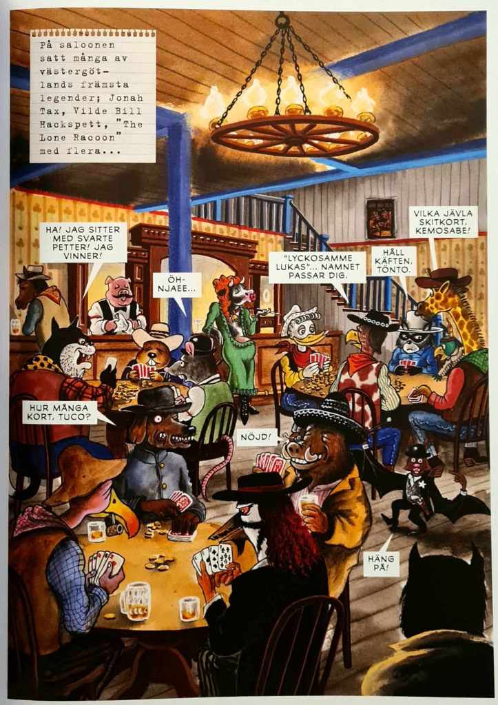I ”Den gode, den onde och Ugly” vräker Joakim Lindengren på med western-referenser; ibland till tecknade serier, men främst till Sergio Leones filmer. Och det är jäkligt kul. Det finns gott om roliga detaljer i bakgrunden, som ICA General Store, och inslag som en duell mellan Jösse James, Västergötlands snabbaste skytt, och Text Turtlewax, Västergörlands långsammaste skytt.