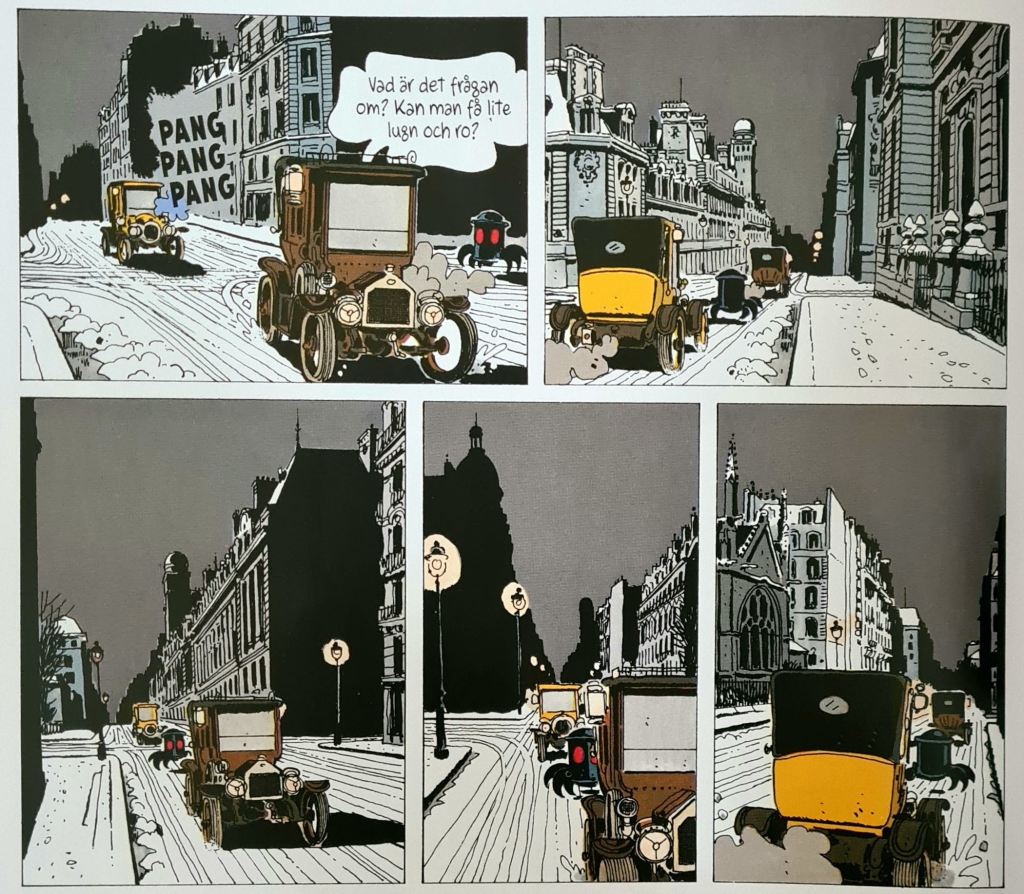 ”Den galne vetenskapsmannen” utspelar sig i januari 1912 och det är ett vintrigt Paris om skildras. Tardi tecknar de snötäckta gatorna på ett sätt som gör att det verkligen ser ut som kalla vinterdagar – eller snarare vinternätter, mycket utspelar sig nattetid. Gatorna ligger öde så när som på en och annan bil, och någon fotgängare som är på väg hem. Stämningen förstärks av den mer än utmärkta färgläggningen.