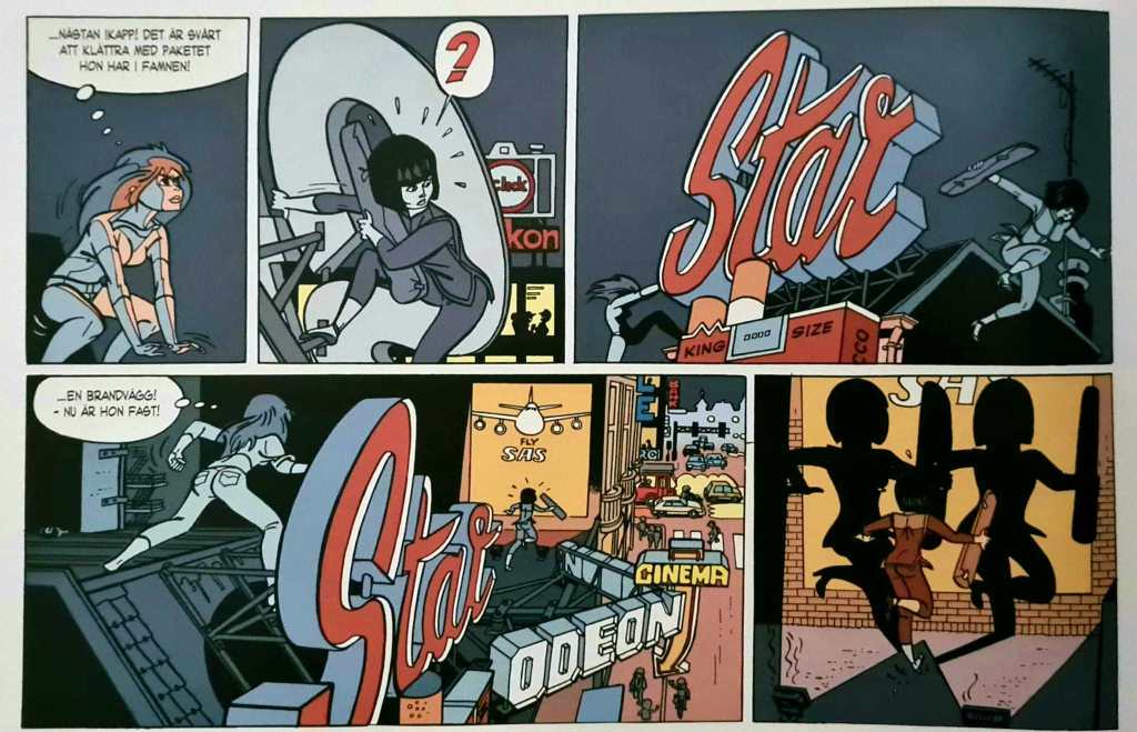 Allt detta på en och samma gång i en och samma serieruta. Detta hade förstås gått att skildra på film, men det hade blivit en något längre scen – och det är alltid svårt att gestalta tankar på film, berättarröster är oftast av ondo. Det här hade självklart också gått att skildra i en roman, men det hade krävt en del utrymme, med antagligen ett flertal stycken för att det inte ska bli rumphugget och förvirrande.