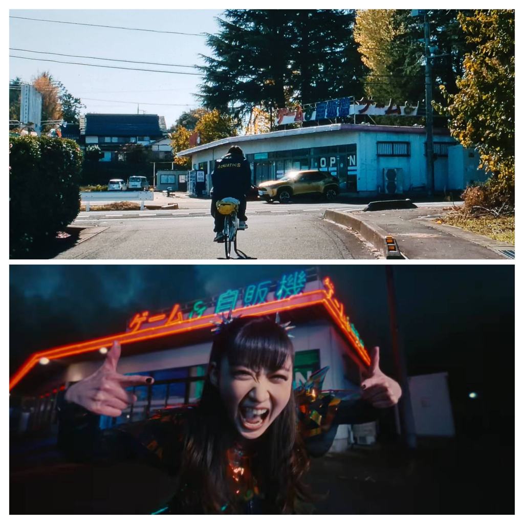 Ungefär en timme in i filmen cyklar en av rollfigurerna till ett kafé som även är en spelhall, han har bestämt möte där. Det här stället ser allt bekant ut … Jo, men visst! Det är ju stället där den senaste BABYMETAL-videon spelats in, ”Headbangeeeeerrrrr!!!!! 15th Night Ver.”. Stället heter Drive-In Nanakoshi och ligger i utkanten av Fujioka City. Se där, då lärde jag mig trots allt något av den här filmen!