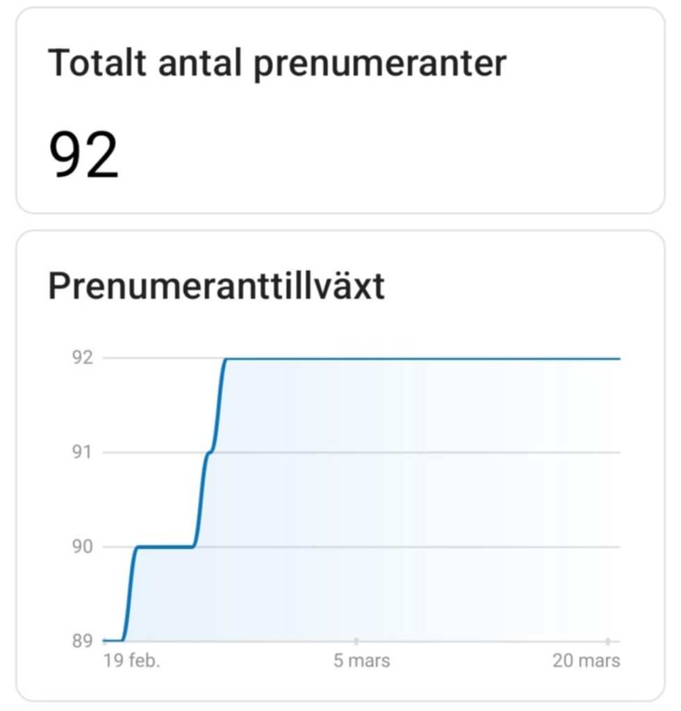 Nu skriver vi mars 2026. Åtta månader senare. Och jag har fortfarande inte kommit upp i 100 prenumeranter! Men det närmar sig — just nu är det 92 stycken. Det vore dock mer logiskt med 1 000 eller 10 000 prenumeranter efter alla dessa år, och med tanke på hur många besökare och klick jag har.