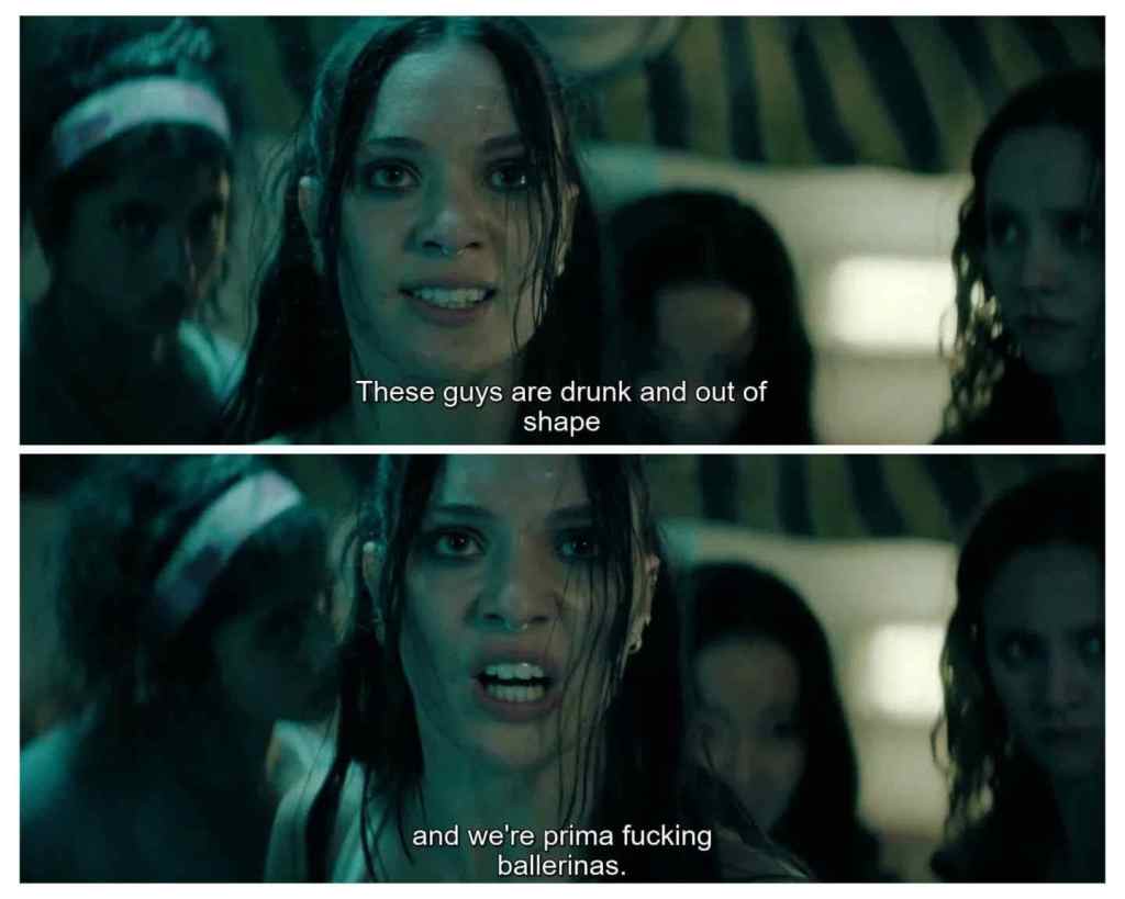 Således måste ballerinorna, anförda av de handlingskraftiga Bones (Maddie Ziegler), fly – och kämpa mot de oräkneliga skurkarna. Detta är de förstås bra på – de kombinerar sina danskunskaper med lemlästning; några av slagsmålen är bokstavligt talat koreograferade som dans. Blodet sprutar hejvilt. De kommer på att de kan sätta knivblad på tåspetsskorna för att enklare kunna snitta upp halsen på motståndsarna.
