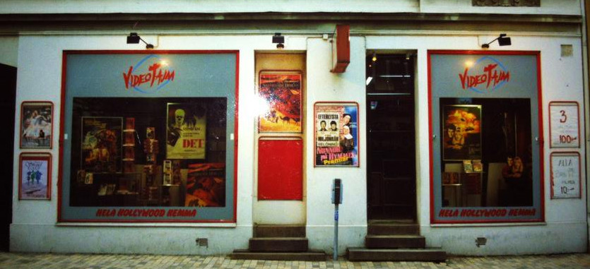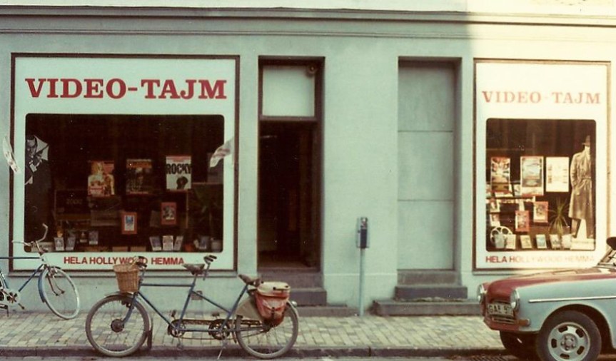 Men jag tänker nog mest på de gamla videobutikerna. De som började dyka upp runt 1980. De flesta har jag inte sett bilder på sedan de slog igen, flera slog igen redan på 80-talet. De finns bara i mitt minne, en del har jag bara vaga minnen av, några har jag glömt vad de hette. Några har jag hittat foton på – bilderna som illustrerar denna text kommer från lite olika ställen och jag hoppas att de ursprungliga fotograferna ursäktar.
